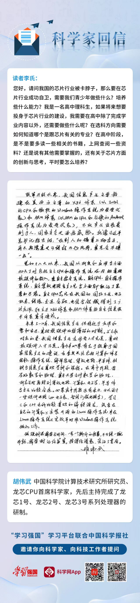 科普不止于知識普及,更是信念傳遞。面對高中理科生關于“青少年想投身芯片行業(yè)該培養(yǎng)哪些能力”的提問,龍芯中科董事長胡偉武在“學習強國”學習平臺——《科學家回信》欄目中給予回復:青少年如果有志于投身于國家信息產業(yè)的建設,應重點關注包括計算機體系結構、操作系統(tǒng)、編譯原理、集成電路、半導體、材料等信息產業(yè)基礎學科的課程。在高中階段,要學好數(shù)學和物理,甚至大學主修數(shù)學和物理,研究生時再轉到集成電路、計算機、電子學、半導體等專業(yè)比較合適。